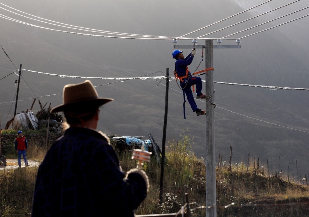 ▲国网同仁市供电公司工作人员进村入户保障群众用电。祁正吉/摄