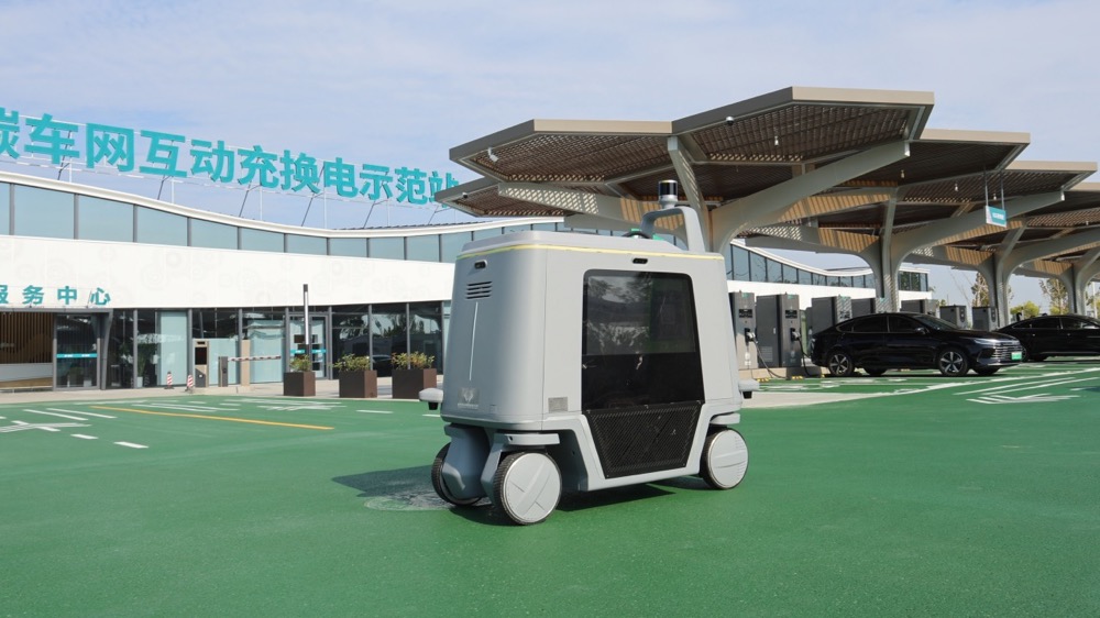 ▲自动驾驶充电宝,支持微信小程序呼叫,可自动行驶至指定车位,在充电高峰期为排队等待的车辆提供机动灵活的充电服务。何延海/摄