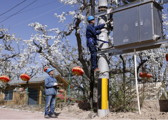 ▲4月15日,国网兰州供电公司员工对“世界第一古梨园”景区供电设施开展“地毯式”隐患排查,了解新增展位、农家乐等用电需求,确保万亩梨园核心景区供电万无一失。李小东摄