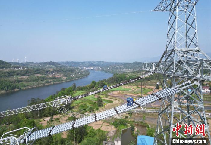 8日,在重庆市合川区沙鱼镇,国网重庆超高压公司输电运检员工完成重庆段最后一段铁塔的登塔走线工作,标志着国家“十四五”电力发展规划重点项目——哈密至重庆±800千伏特高压直流输电工程(以下简称:“疆电入渝”特高压直流输电工程)重庆段完成走线验收。