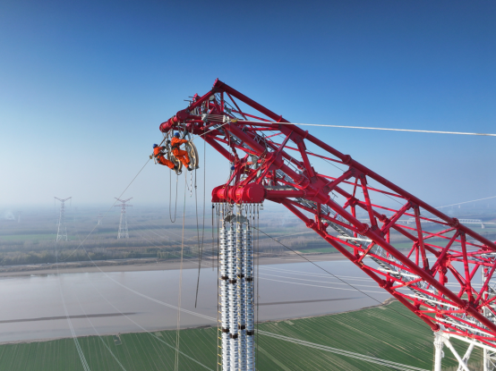 位于山东段的黄河大跨越是陇东—山东工程最具挑战的工程之一。“黄河大跨越段线路长约2806米,导线展放最大牵引力达到16.5吨。一般来说,跨越距离越长,放线张力越大,技术难度高。”赵建文说,“为此,我们提前组织各参建单位深入现场复勘,科学制定了详尽的跨越施工方案,并采用山东电力自主研发的集控智能牵张设备及放线架,确保了导线展放安全高效。”