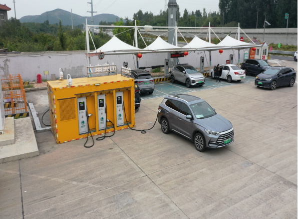 图为国网(山东)电动汽车服务有限公司在10个热点高速服务区充电站部署移动充电舱,提升新能源车车主清明假期绿色出行充电体验。孙卓新/摄