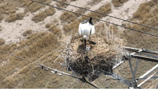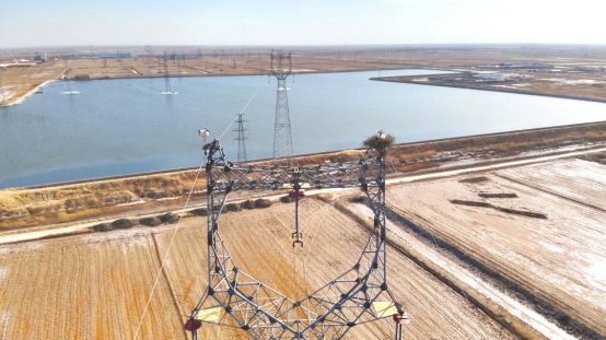 ▲东方白鹳在输电杆塔上筑巢繁殖。