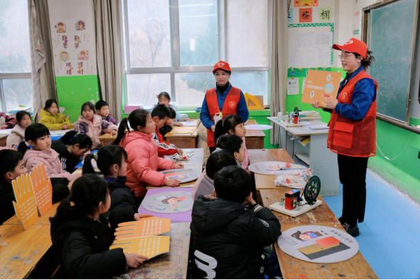 ▲国网西和县供电公司“黄河之滨”志愿者服务队队员在课堂上宣讲安全用电知识。