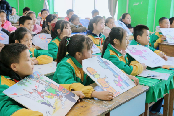 ▲甘肃陇南西和县大桥镇九年制学校四年级(2)班的同学们在认真听志愿老师传授的安全用电知识。
