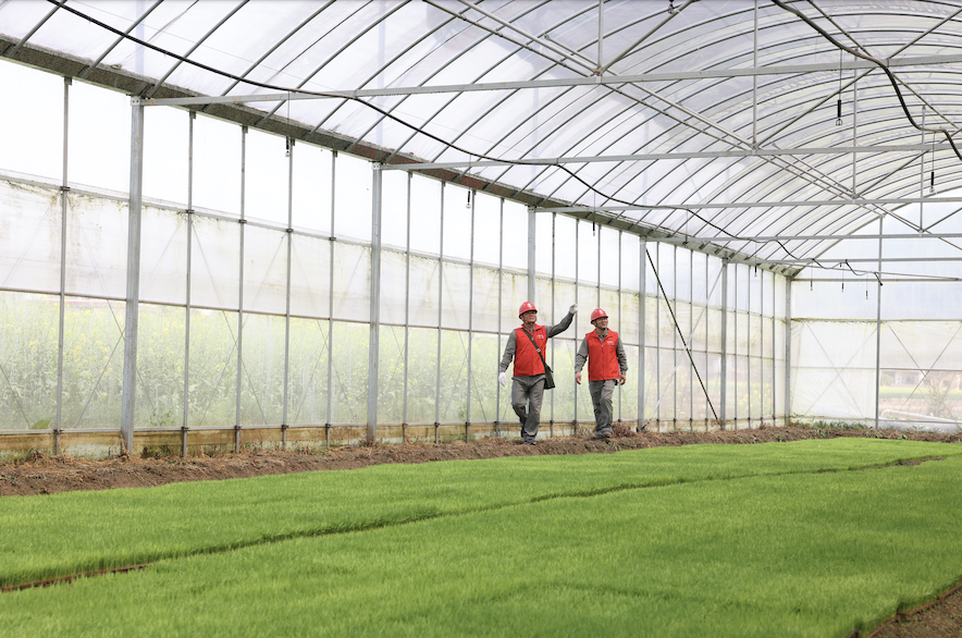 在双峰源石村智能化集中育秧工厂,国网湖南娄底供电公司东方红(电骏马)共产党员服务队正在检查智能滴灌设备。