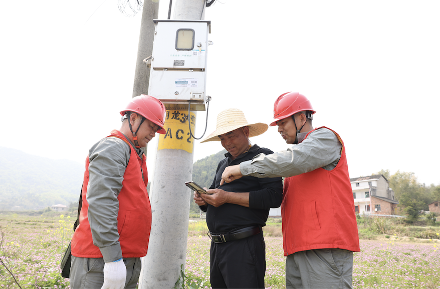 月龙村种粮大户贺春红在国网娄底永丰供电所工作人员的指导下进行扫码灌溉