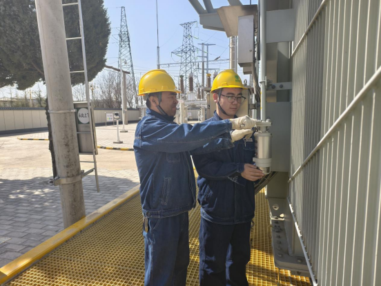 “更换完成后,应对呼吸器进行密封性检查。确保呼吸器与联结管密封良好,无漏气现象。同时,观察硅胶变色情况,如上部颜色发生变色则说明呼吸器密封性不严,需及时检查并处理。”在收工现场,运维老师傅安平正在利用此次工作机会为新入职员工王超讲解更换硅胶的注意事项,这也是该公司落实“导师带徒”“老带新”工作的一个缩影。