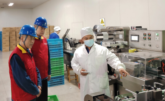 ▲国网甘肃电力(一心百合)连心桥共产党员服务队在兰州太宝制药有限公司包装车间,了解客户药品生产情况和用电需求。李育东/摄