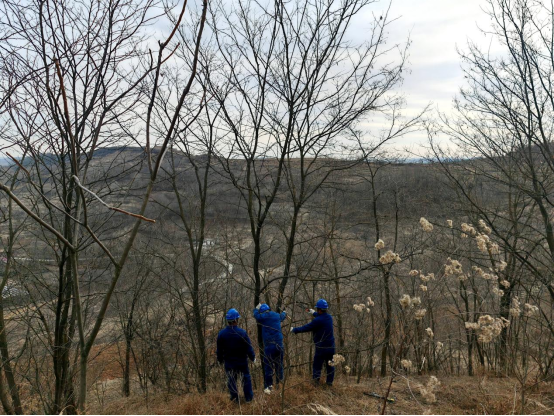 甘肃陇南西和县供电公司员工沈润辉、张军来、赵国胜在长道镇小石村清理10千伏111长石线051号至053号杆线路通道树障