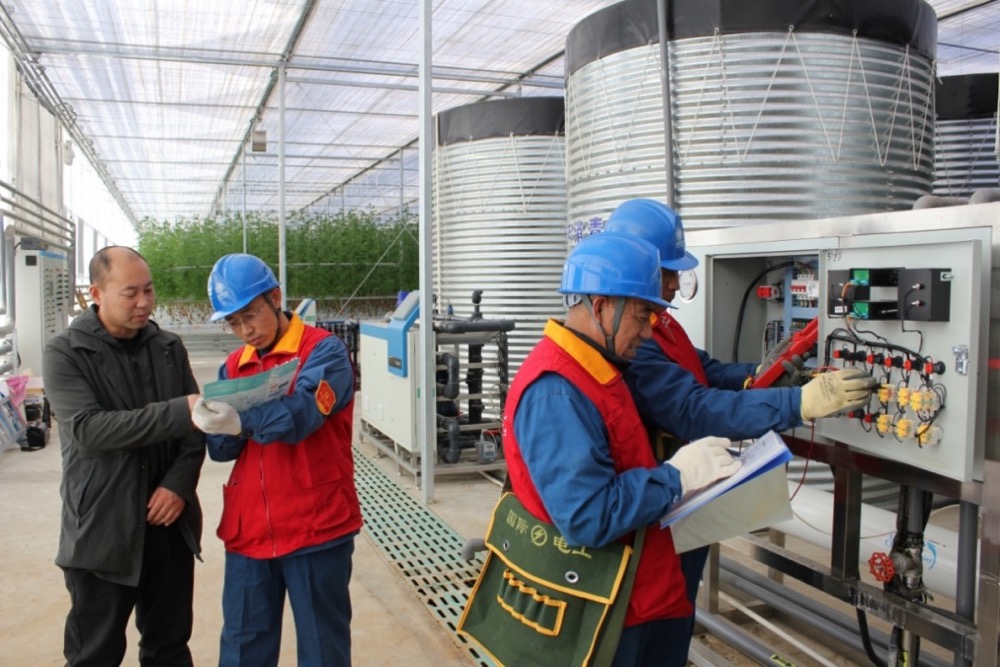 3月17日,国网山西天镇县供电公司太行黎明共产党员服务队和青年突击队成员段峰、赵国甲、于兴旺来到薛三墩农业科技示范园智慧采摘基地,协助基地对输水管网、泵站、蓄水池、灌溉等科技生态种植循环系统用电设备进行检查,全力护航农村新型农业生产用电安全。