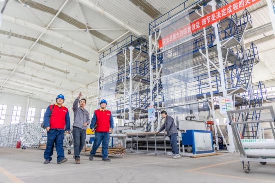 走进生产车间,5条全自动化生产线上,制膜设备轰鸣作响,工人们正忙着收卷、称重、包装,一卷卷吹塑成型的地膜被整齐堆码在一起,一派繁忙景象。甘肃省星联塑业有限公司是一家专注生产“高强度高耐候易回收地膜(高堡膜)”,利用获中国发明专利金奖的“基于拉伸流变的高分子材料塑化输运方法及设备”(简称ERE技术)研制而成,是打造地膜生产、回收清洁造粒、高值化再利用循环产业链的企业,可有效解决地膜行业因“难以回收、收而无用”带来的白色污染难题。