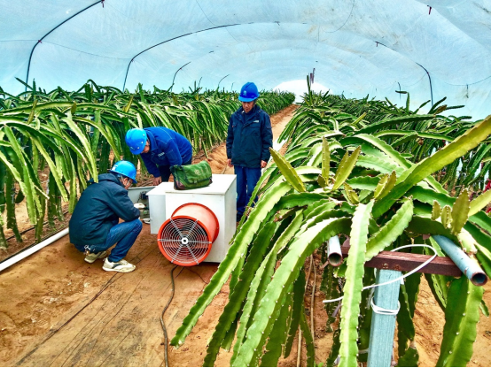 “火龙果生长喜温暖湿润半阴环境,要想种好,就要做好温度和湿度控制。”火龙果基地负责人刘军强介绍说,基地引进了4个集中式暖风机设备和4个自动化灌溉系统对大棚温度和湿度进行精准控制,这也使得年用电量达到1万千瓦时左右。
