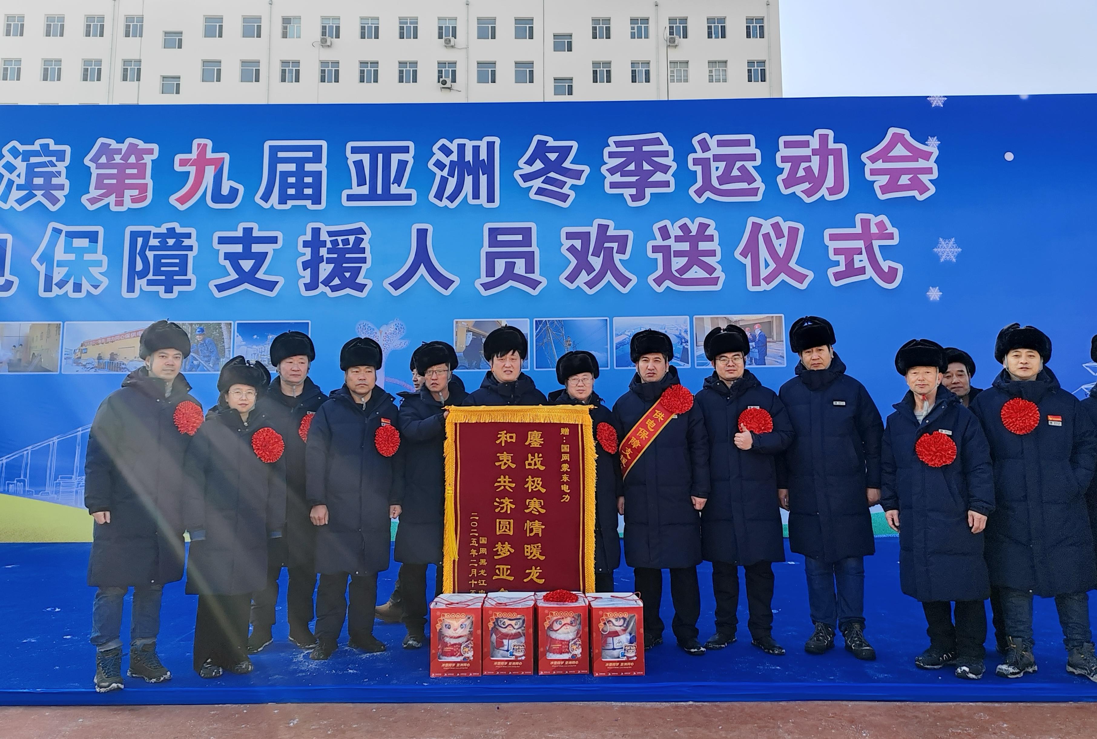 2月15日,国网黑龙江电力向国网蒙东电力保电支援团队授锦旗,对国网蒙东电力支援“亚冬会”保电人员的辛勤付出表示感谢。
