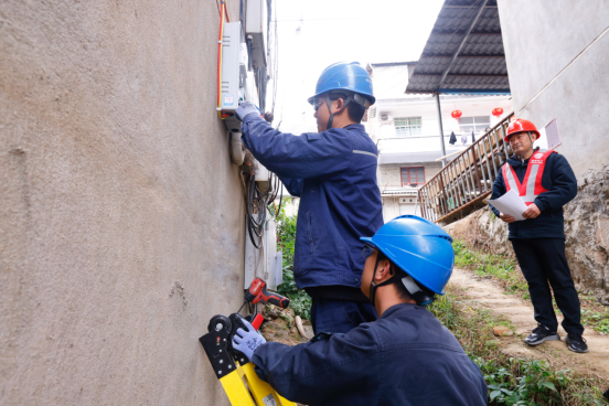 2月13日,福建南平建阳区供电公司的电力工人们正忙碌地安装电表,他们熟练地架设电线、固定电表箱,为即将到来的春耕生产提供坚实的电力保障。