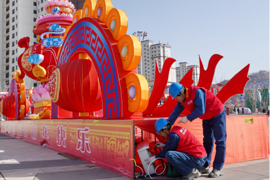 图为:国网平凉静宁县供电公司员工武强、刘伟对成纪文化广场灯展区线路进行全面“体检”。吕双娟/摄