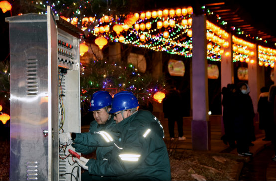 除夕(1月28日)夜,国网威海市文登区供电公司员工在文山公园灯光观赏区检查配电线路设备。