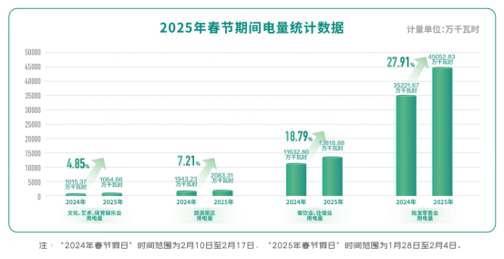 在各领域用电量数据中,春节假期批发零售业用电量高达4.5亿千瓦时,同比增长27.91%。以山东济南为例,春节假期,批发零售业用电量4569.74万千瓦时,占全省批发零售业用电量的10.14%,比2024年春节假期增长34.95%。
