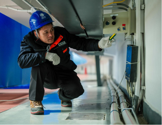 国网黑龙江电力亚冬会客户侧电力保障服务专班成员检查哈尔滨速滑馆内开关箱回路。解琳琳 摄