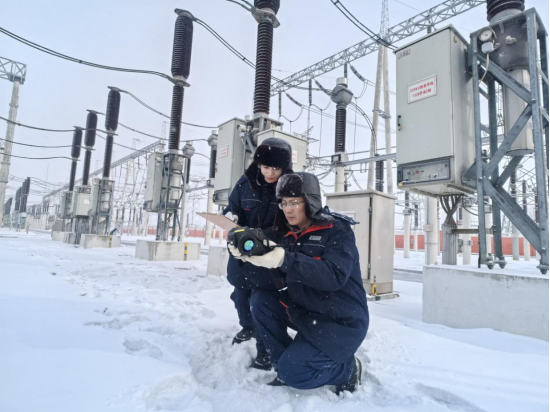 图为:2月7日,第九届亚冬会开幕式当天,国网黑龙江超高压公司员工付东明、薄秋影对亚冬会重要保电500千伏变电站进行雪中特巡工作。何炳华/摄
