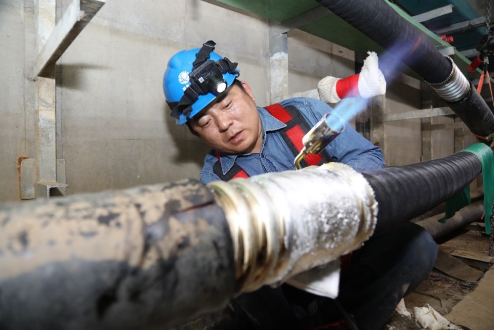 ▲电缆检修人员手持火枪将熔化的铅料均匀涂抹在铝护套表面。(赵旌朝 摄)