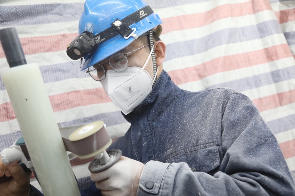 ▲电缆检修人员用不同规格的电动打磨纸飞速打磨电缆绝缘,飞溅起的白沫布满全身。(赵旌朝 摄)