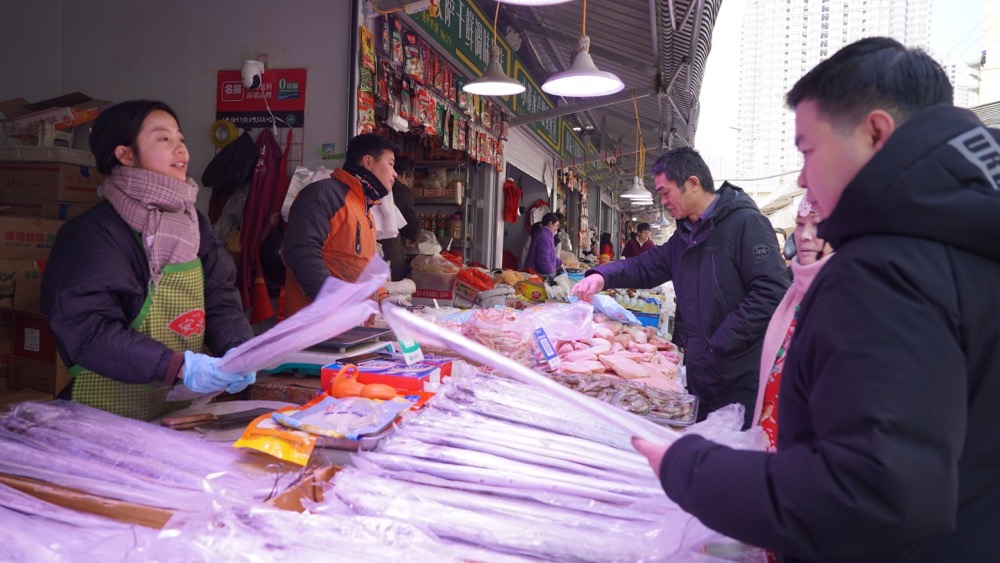 1月26日上午,在甘肃省兰州市城关区庙滩子集贸市场,草鱼、带鱼等生鲜产品在摊位前琳琅满目的摆放着,空气中弥漫着海鲜的味道。商户们忙得不亦乐乎,一边忙着介绍产品,一边称重打包,市场里处处洋溢着浓厚年味儿。