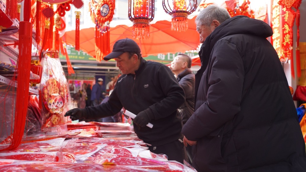 图为:年货市场上选购春联及灯笼的顾客。 李春莲 摄
