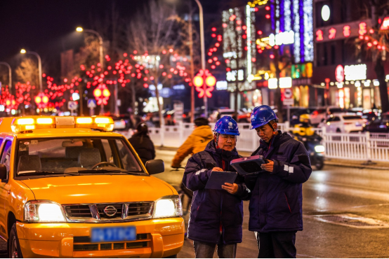 ▲春节前夕,国网北京昌平供电公司员工在昌平城区商业中心对辖区供电设备开展特巡。刘小军/摄