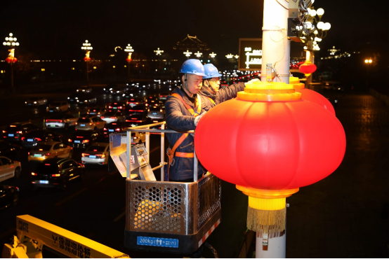 ▲国网北京电力照明中心华灯班人员正在长安街调试检修大红灯笼。张超/摄