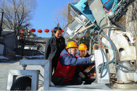 春节前夕,国网北京门头沟供电公司清水供电所员工在瓦窑村冰雪节活动现场检查用电设备。(张文静 摄)