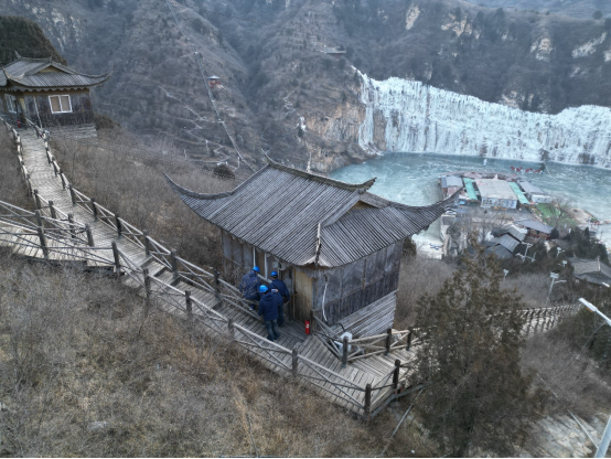 来到霞云岭村金水湖景区,阳光洒在银装素裹的金水湖上,冰柱、冰凌、冰壁镶嵌其间,层层复垂,视觉冲击力十足。湖畔一侧的峭壁上,冰晶凝结成玉带自崖壁倾泻而下。景区内精心布置的装饰,为这冬日的景色增添了几分活泼与温馨。