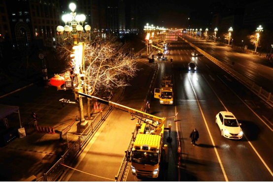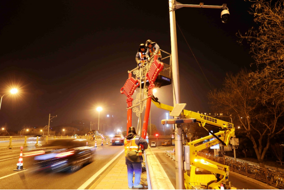 小年夜当晚,长安街上,国网北京电力城市照明管理中心春节景观布置保障团队正在对灯笼灯饰进行24小时特检特巡。