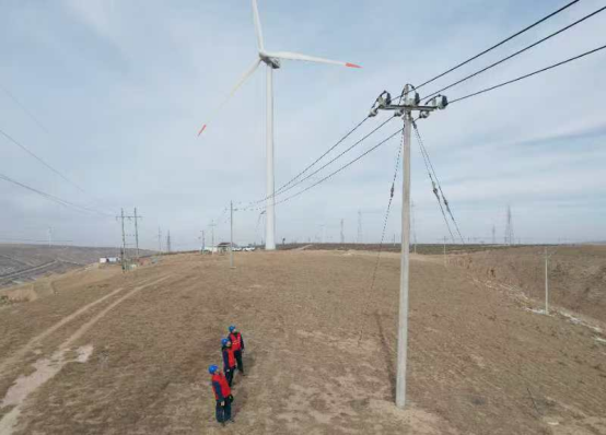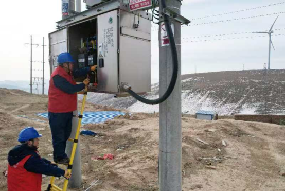 1月17日,春节前夕,国网盐池县供电公司职工在位于宁夏吴忠市盐池县南部1820米的麻黄山上检查供电台区设备及线路,保障风力发电场节日期间正常运行,助力能源绿色发展。