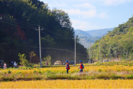 国网成县供电公司员工在成县陈院镇卢沟村水稻种植基地巡视线路,助农丰收。