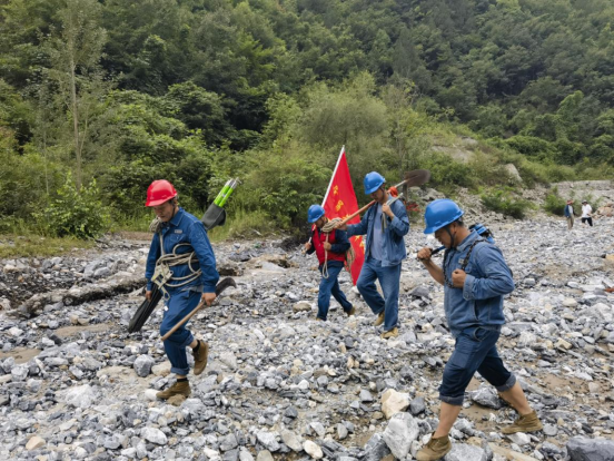 国网成县供电公司员工雨后徒步前往10千伏王天线勘察抢修现场。