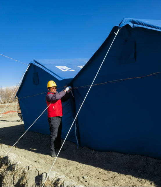 当他到达安置点时,眼前是一片忙乱而又有序的景象,简易帐篷密密麻麻地排列着,而电力线路,如同这个临时社区的血管,维系着这里基本的生活运转。作为措果乡安置点区域负责人,旦达负责与当地政府进行沟通协调,统计物资需求、集中调配、物资运送等工作。