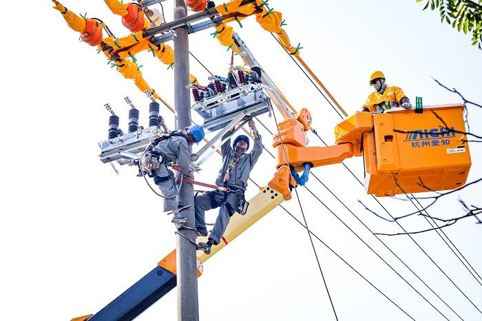 国网宁波市鄞州区供电公司工作人员在鄞县大道沿线开展带电作业,为10千伏线路加装智能开关。洪浩哲/摄