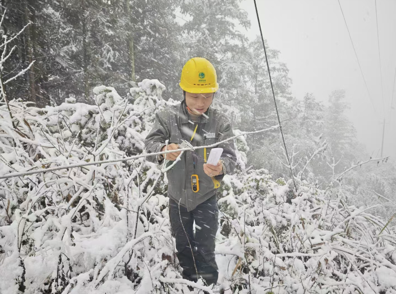 在现场,工作人员顶着严寒,冒雪前行,克服山路崎岖、雾气弥漫等因素,毅然决然踏上覆冰监测的征途,一步一步踩着积雪,穿梭在白茫茫的山间,达到观冰哨,熟练拿起游标卡尺、风速仪、温度计进行精准测量,及时汇报现场温度、湿度、覆冰情况,认真巡视每一条线路和每一基杆塔覆冰状况,全力保障电网安全稳定运行。