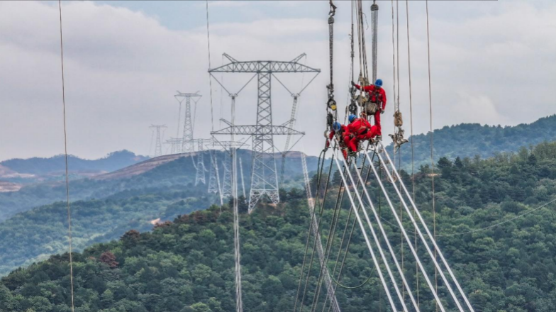 山西省临汾市古县,由国网山西送变电公司承建的陇东-山东±800千伏特高压直流输电线路工程(晋2标)施工现场,高空作业人员正在近70米高空进行附件安装作业。王浩/摄