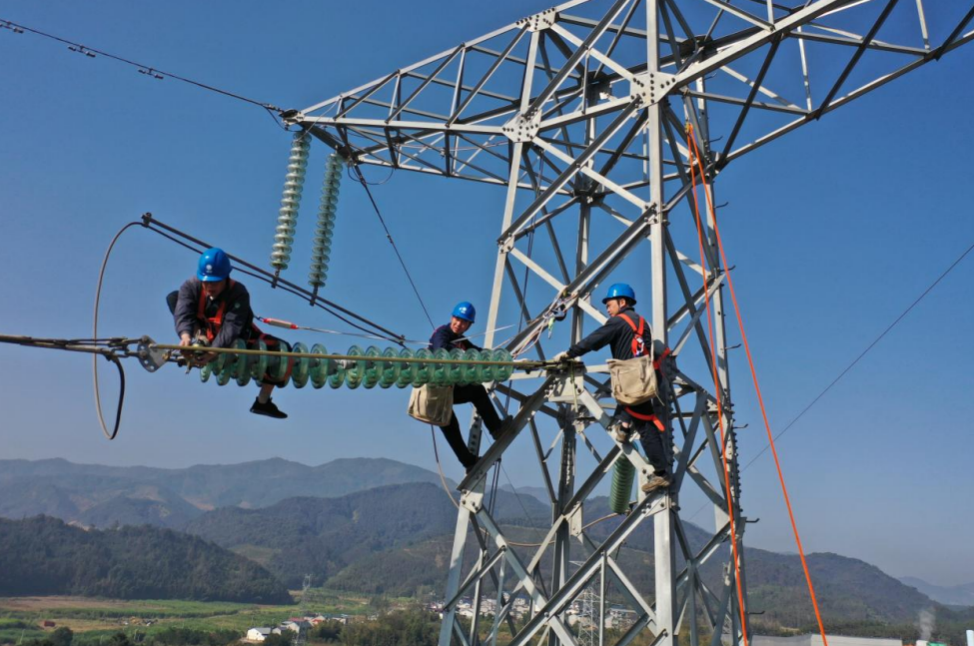 高塔凌云瓷瓶裂,巧匠登空换玉玦。12月1日,在顺昌县和兴实业有限公司附近的220千伏宝华Ⅱ路16、17号塔上,国网邵武市供电公司的工作人员正在操作老旧绝缘子更换工作,为该线路平稳度冬保驾护航,确保辖区用户冬季安全可靠用电。
