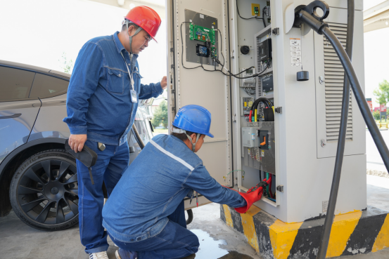 图一:濉溪县供电公司员工为濉溪高速服务区电动汽车充电站设备进行检测。储运涛摄