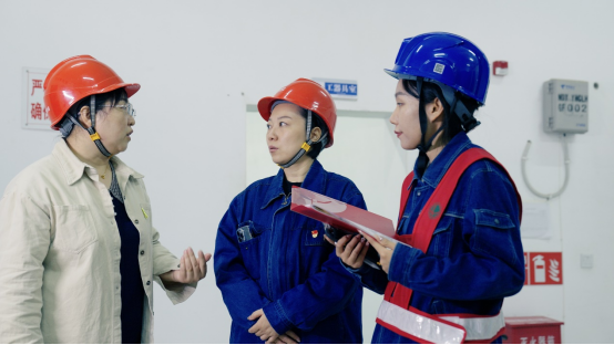 图为:2024年9月30日,国网宁东供电公司营销人员深入宁夏宁东泰和新材有限公司进行高危及重要用户安全检查工作,并向客户介绍国家电网“电e金服”平台,落准落稳助企便利。(郭辰晨/摄)
