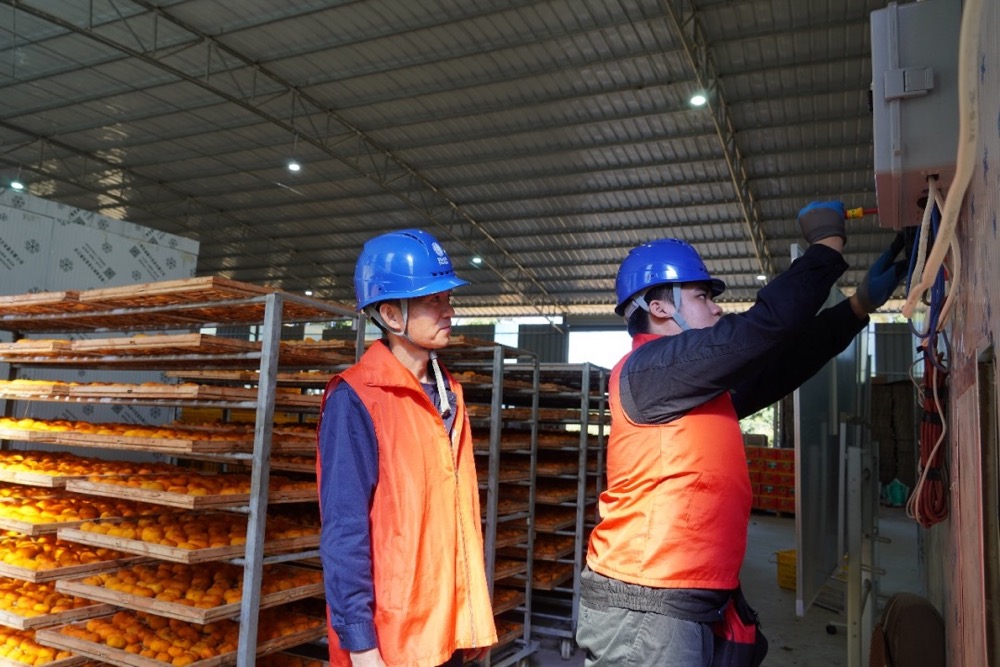 ▲当地供电部门工作人员为果农烘干设备检查用电设施。(吴玲 摄)