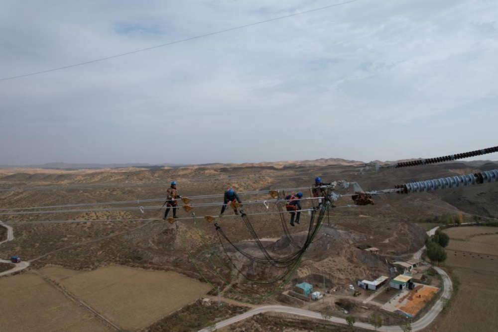 2024年10月25日,在宁夏中卫市中宁县余丁乡境内的宁夏至湖南±800千伏特高压直流工程(宁1标段)N0027号铁塔施工现场,国网宁夏电力有限公司施工人员正在进行平衡挂线作业。
