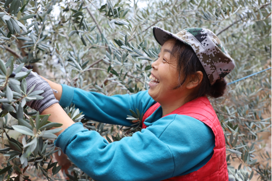▲桔柑村赵大姐在油橄榄基地采摘橄榄果。