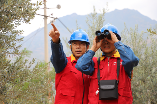 ▲国网甘肃电力(陇南金橄榄)连心桥共产党员服务队队员王结荣和白伟红巡视维护油橄榄加工厂主线路。