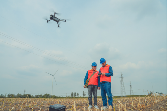 ▲国网濉溪县供电公司服务人员正在用无人机巡视田间线路。储运涛/摄