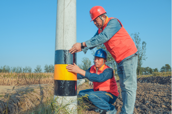 ▲国网濉溪县供电公司服务人员给田间电杆张贴防撞条。储运涛/摄