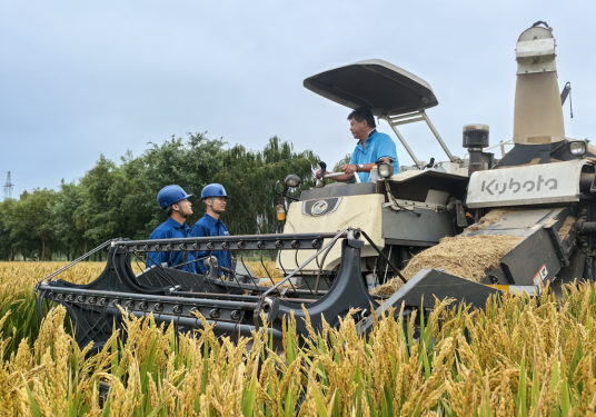 ▲国网高青县供电公司员工在水稻收割现场开展用电服务。